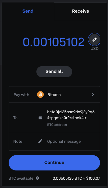 So now that I have a BTC Address (bc1q0jzl25psn9dx9j2y9q64tpqmkc0r2rslhnk4lr), I can go to Coinbase and send it some BTC.